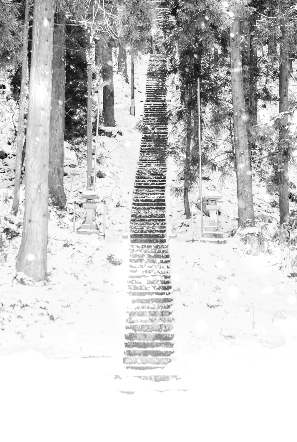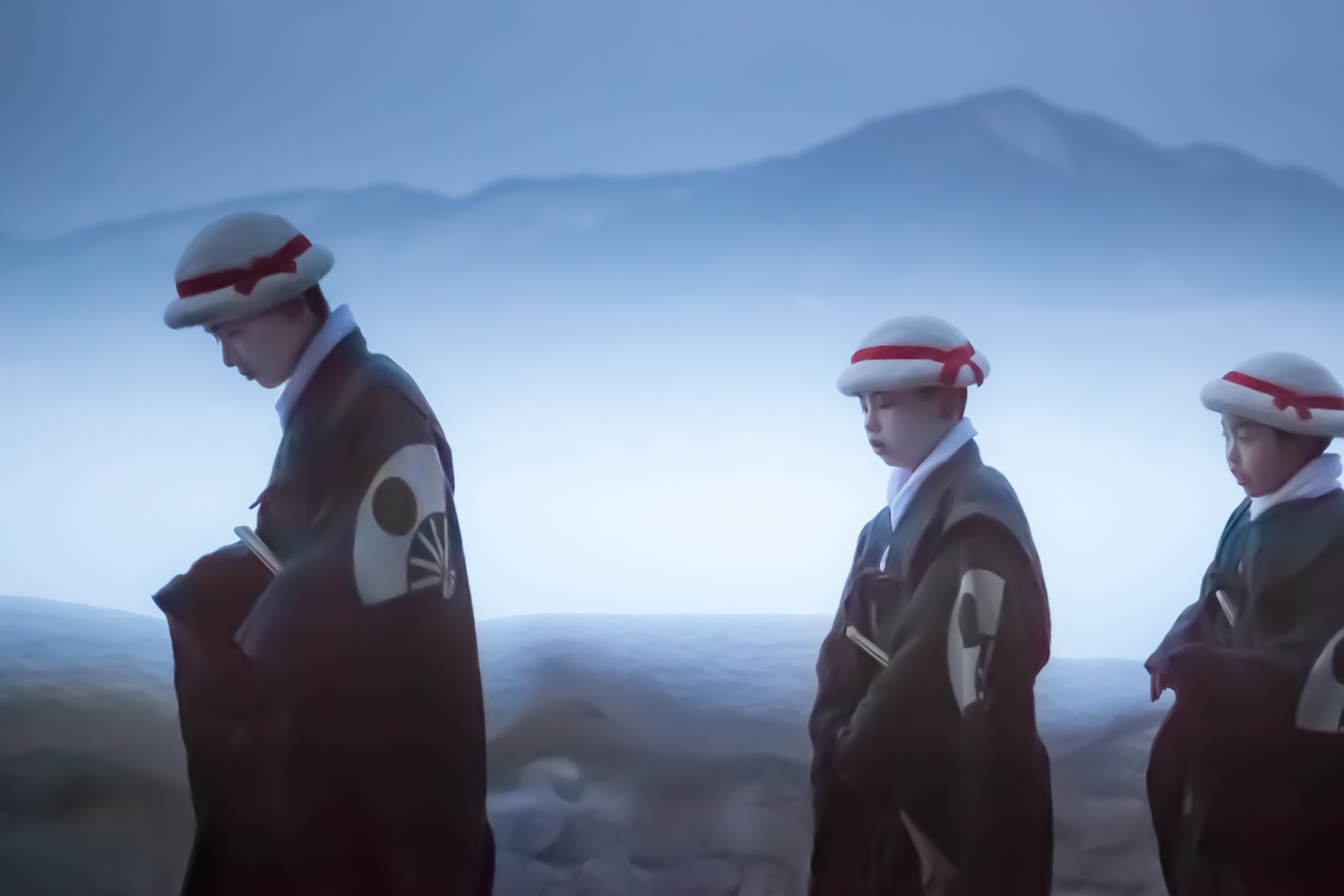 One of my favorite photos from the “Fluorite Fantasia” project is of a star-filled sky behind the silhouette of a large tree. It’s as if I could hear the whispers of the stars in the sky. And there is one more; it’s a picture of a staircase in the “ZAIDO” book. It is such a long, long staircase that you can’t see how far it goes. Where does it lead? Does it continue into the past or into the future? Maybe it’s a path that goes back and forth between this world and the next. When I saw the staircase, it felt like if I climbed these stairs, I could meet my late father at the end of it. Looking at this staircase was like an Escher painting. You wouldn’t know whether you were going up or down. It’s a strange staircase that can be interpreted differently by the viewer. Another rather striking photo from “ZAIDO” is of children walking to the festival. Their young gait takes them on a long walk through extremely snowy roads and cold that sometimes reach -20°C. When this picture was taken, the moon was still in the early morning sky, and it was a very magical scene, as the ridges of the mountains in the distance looked beautiful but were covered in fog. I had the strange feeling someone else was making me shoot.